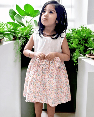 Soft, sweet, and made for sunshine — our Blossom Bow One-Piece is the perfect pick for your little flower. This charming sleeveless dress is crafted from breathable organic cotton, with a solid white upper and a floral-printed skirt, all stitched as a single, flowy silhouette.