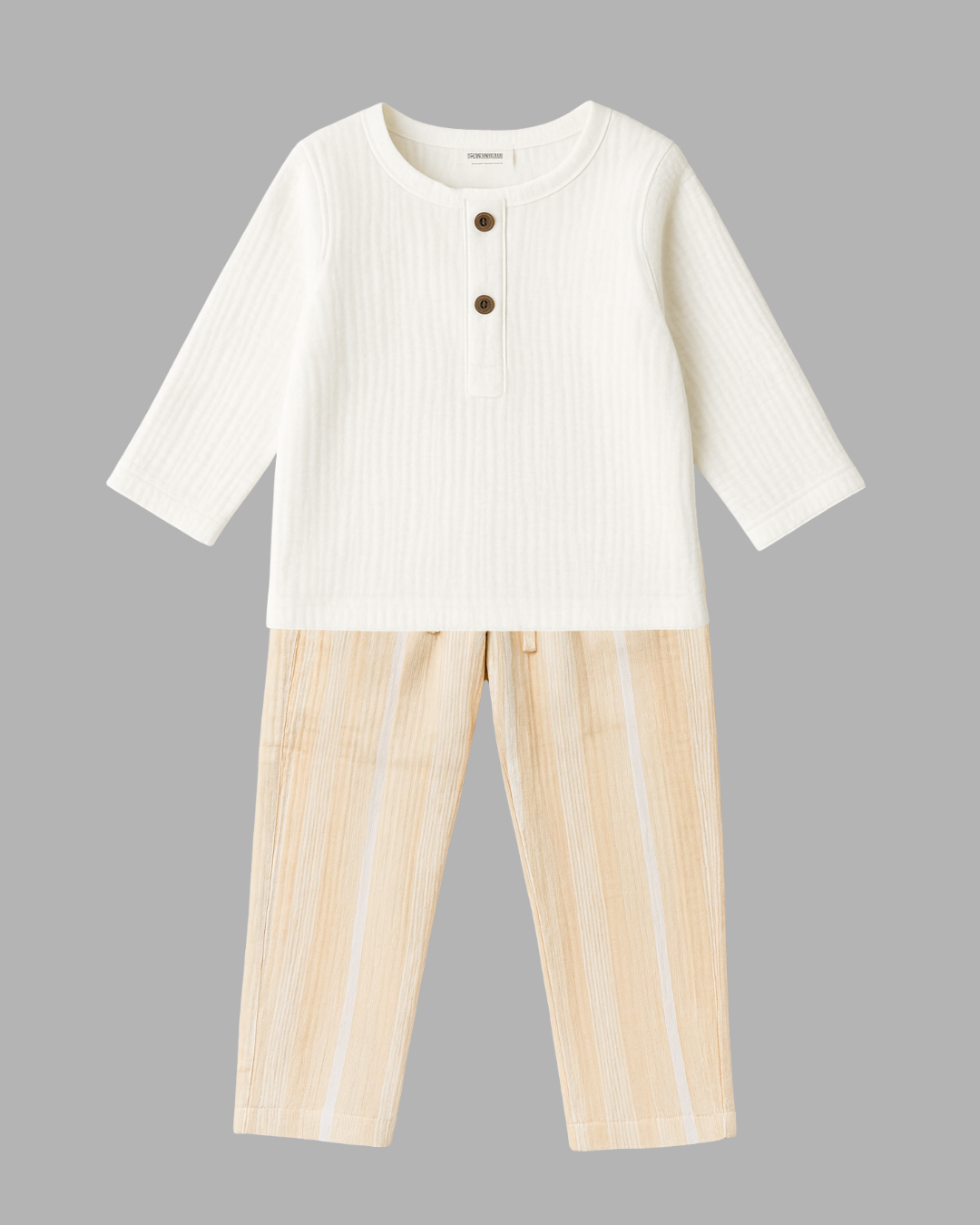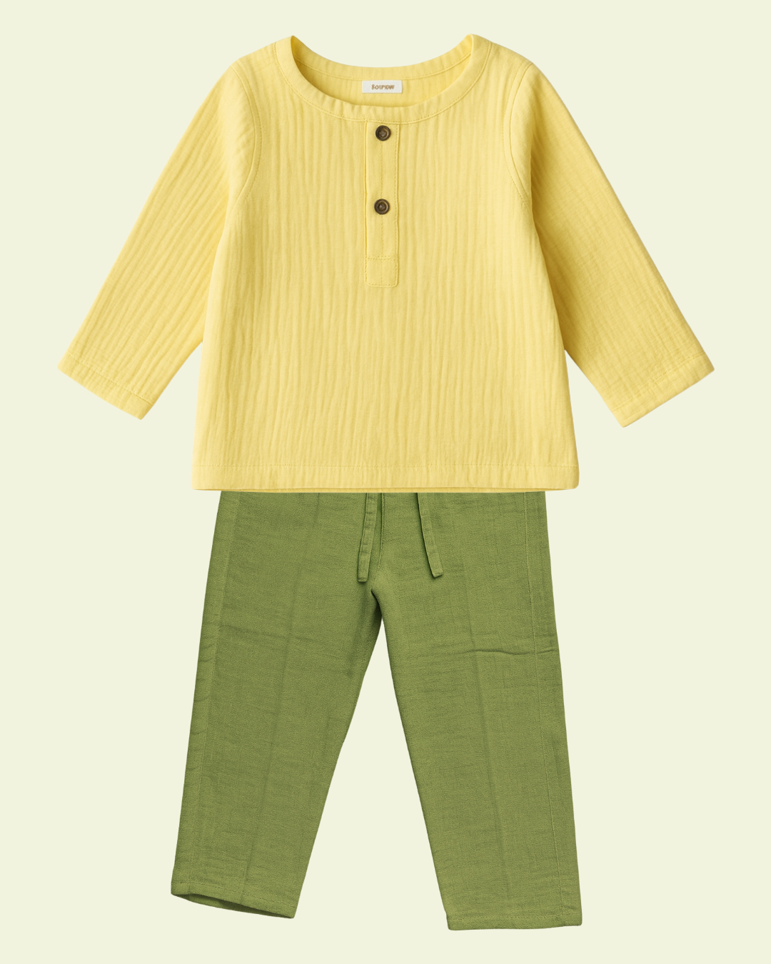 Everyday comfort meets timeless style with this combo of 3 Short Kurtas + 3 Pajamas, all made in 100% organic muslin double gauze. Soft, breathable, and fuss-free — perfect for play, naps, or festive moments.