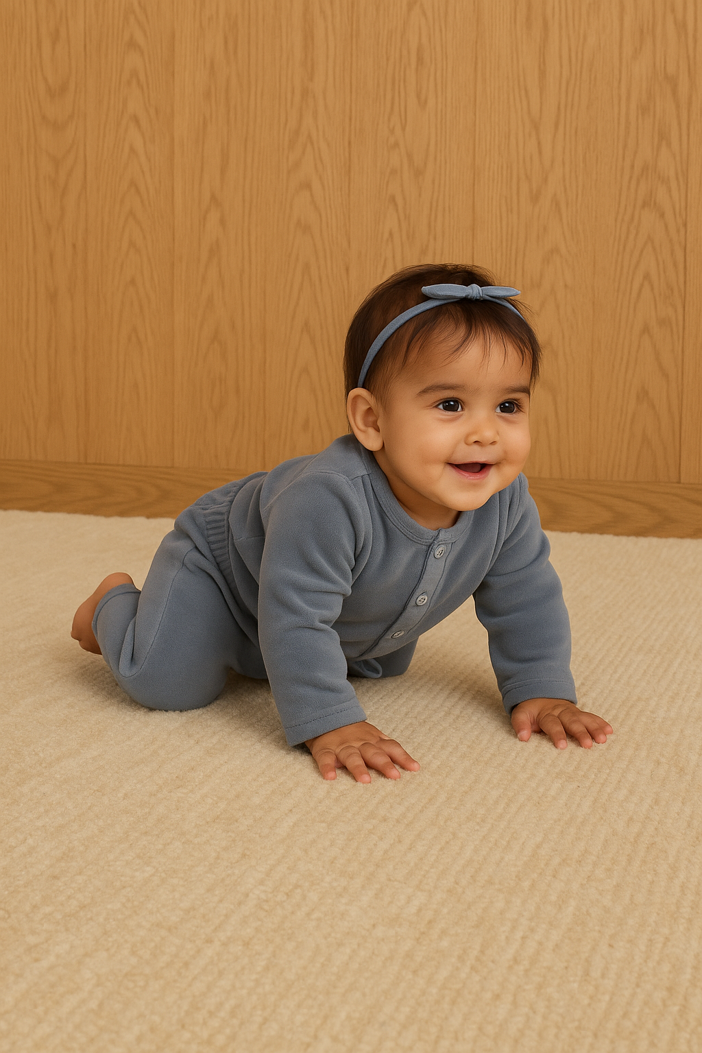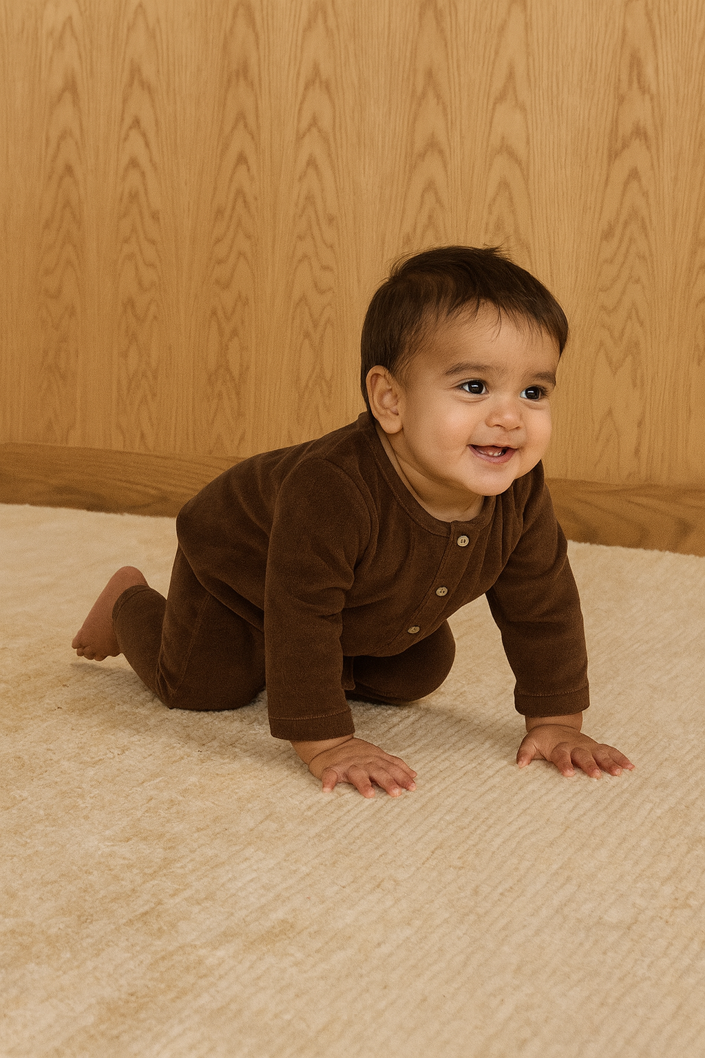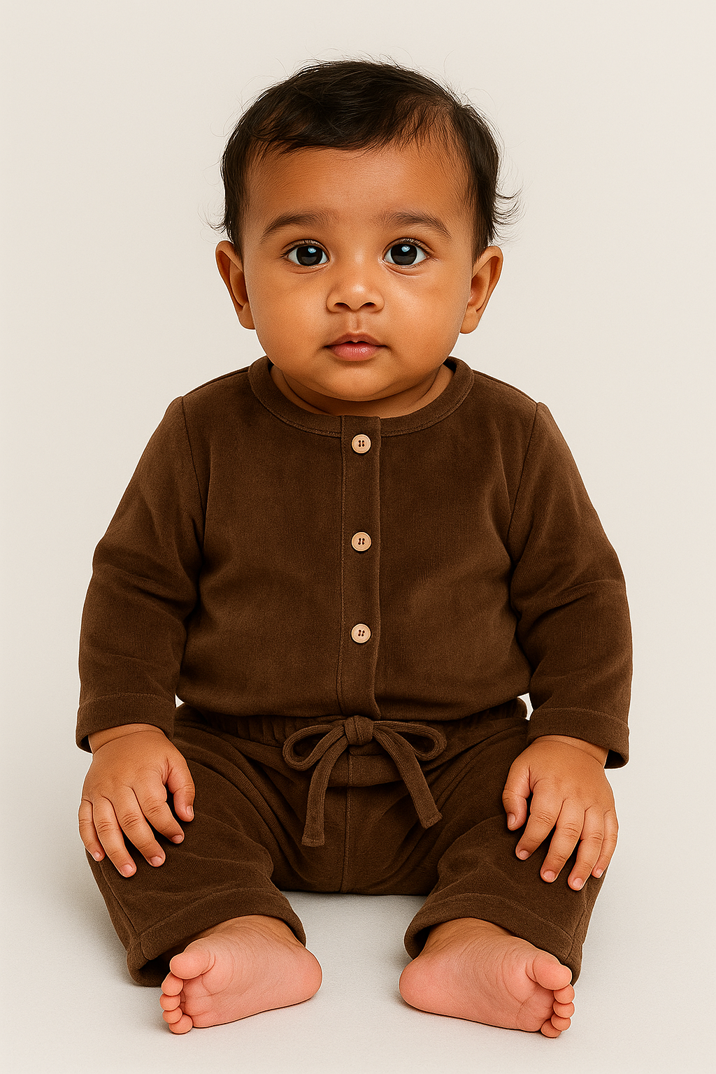 Made in 100% cotton, this warm cotton velvet set is perfect for you baby’s all day lounging in the winter season. The shiny velvet texture makes this look elegant and the cotton fabric ensures the perfect warm breathability, warmth and comfort for your little one.