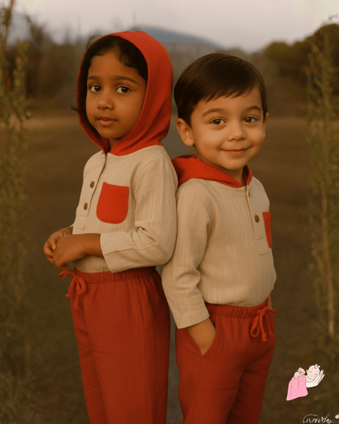 Each set includes a short kurta-style top with a Henley neckline and coconut-shell buttons, paired with matching full-length pajamas that feature a soft elastic waistband and adjustable ties. Thoughtfully designed for freedom of movement, they’re perfect for everything from playtime adventures to nap-time cuddles.